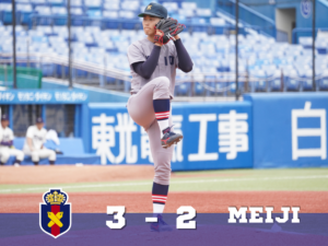 対明大二回戦は、1回裏、連打などで一死一二塁の窮地を招くと、続く打者に適時二塁打を浴び、先制を許します。
